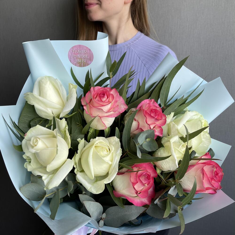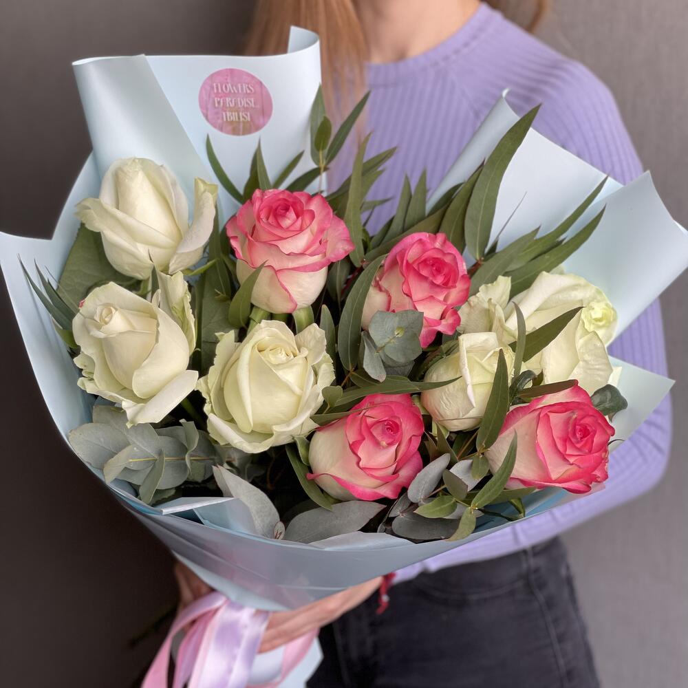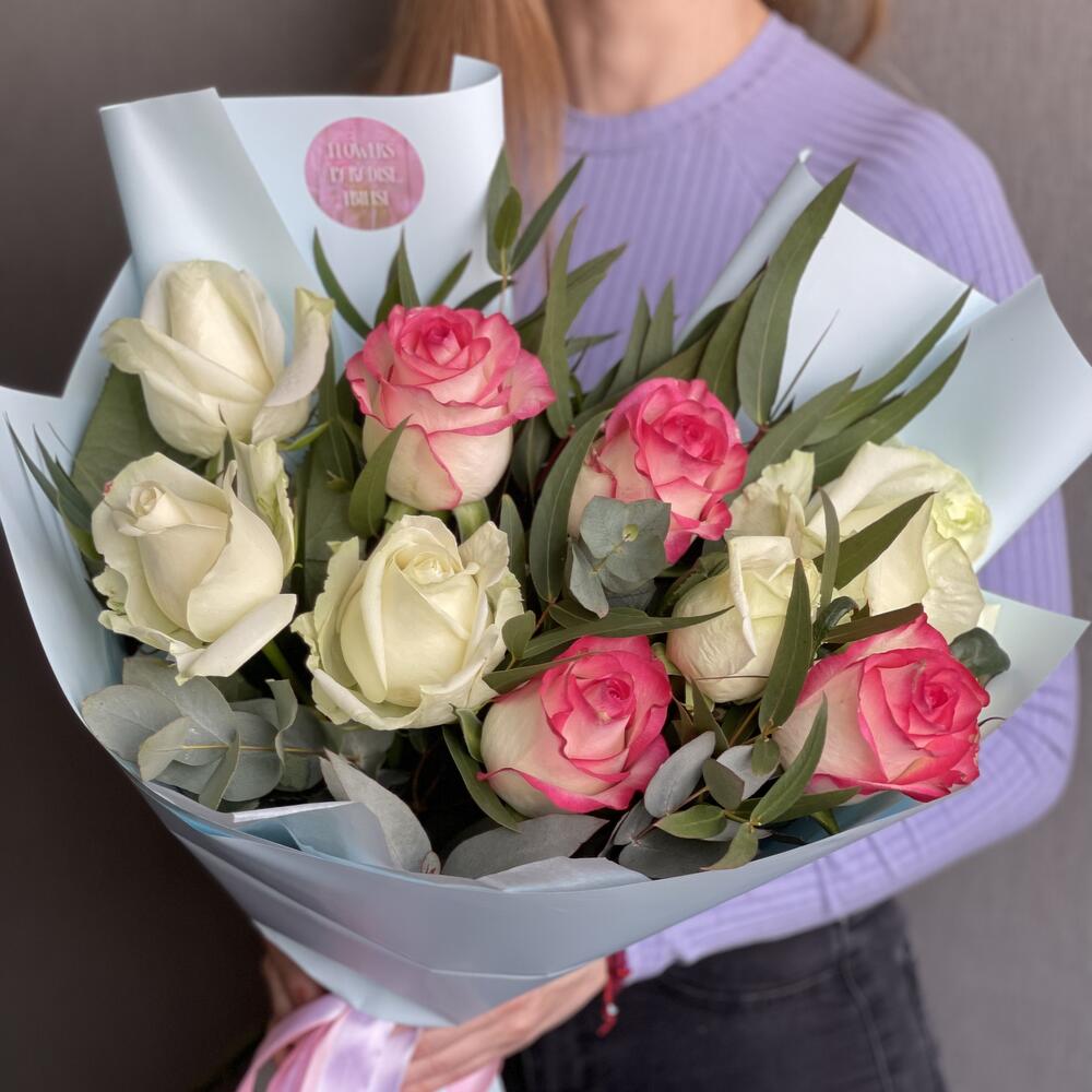 белая и розовая роза – 9 шт. Упаковка – 1 шт. Атласная лента – 1 шт. Эвкалипт – 4 шт.