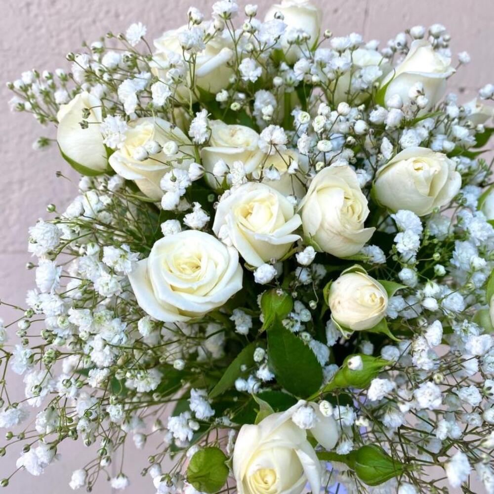 Роза кустовая – 5 шт.Гипсофила – 3 шт.Лента атласная – 1 шт.