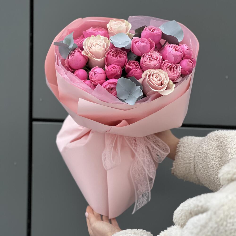 Кустовая пионовидная роза – 6 шт. роза одноголовая pink mondial – 3 шт. Эвкалипт – 2 шт. Оформление – 1 шт.