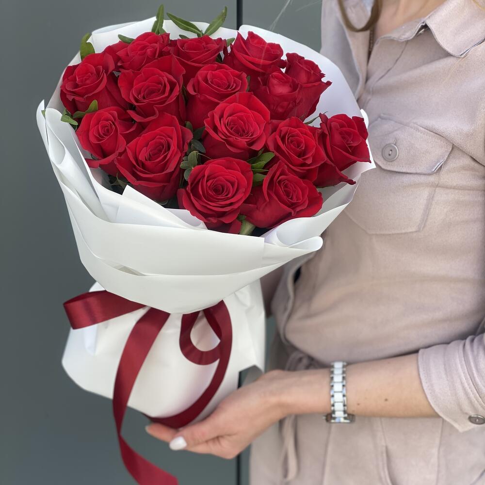 Роза Freedom – 15 шт. Оформление – 1 шт. Эвкалипт парфиволия – 2 шт.