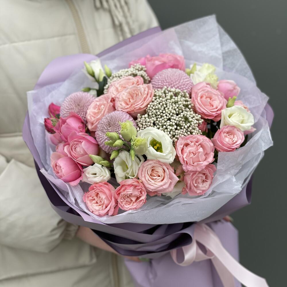 Эустома – 3 шт. Хризантема момоко – 3 шт. Озотамнус – 2 шт. Кустовая пионовидная роза – 3 шт. Кустовая роза Бомбастик – 3 шт. Оформление – 1 шт.