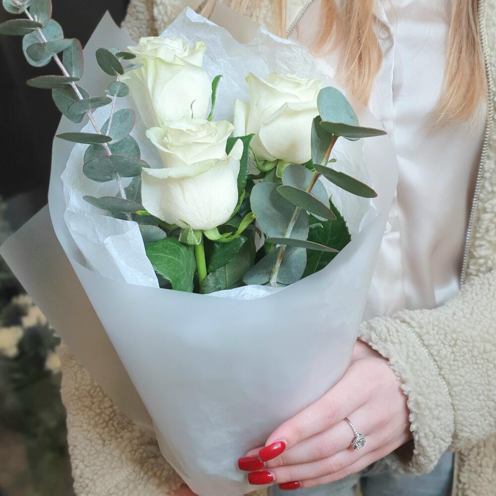 Роза – 3 шт.Эвкалипт пучок – 1 шт.Упаковка дизайнерская – 2 шт.