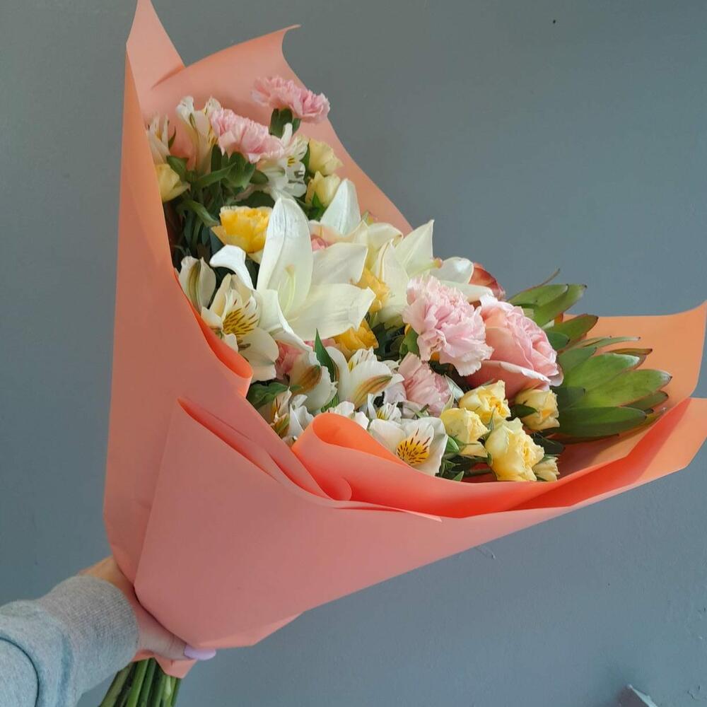Альстромерия – 6 шт.Роза кустовая – 3 шт.Лента атласная – 2 шт.Диантус – 4 шт.Фисташка – 4 шт.Роза пионовидная – 3 шт.Упаковка дизайнерская – 3 шт.Лилия Азиатская белая – 2 шт.леукондендрон – 2 шт.