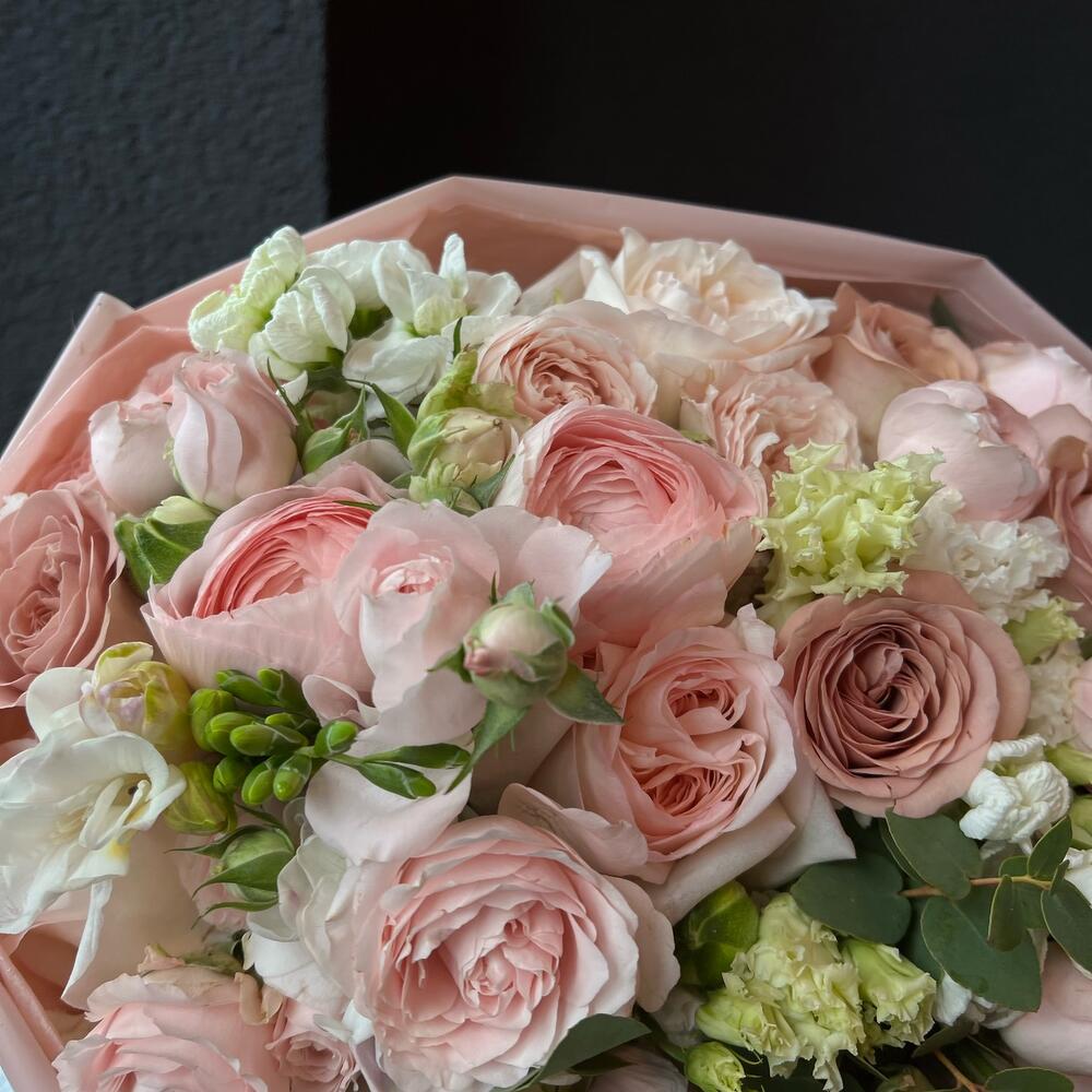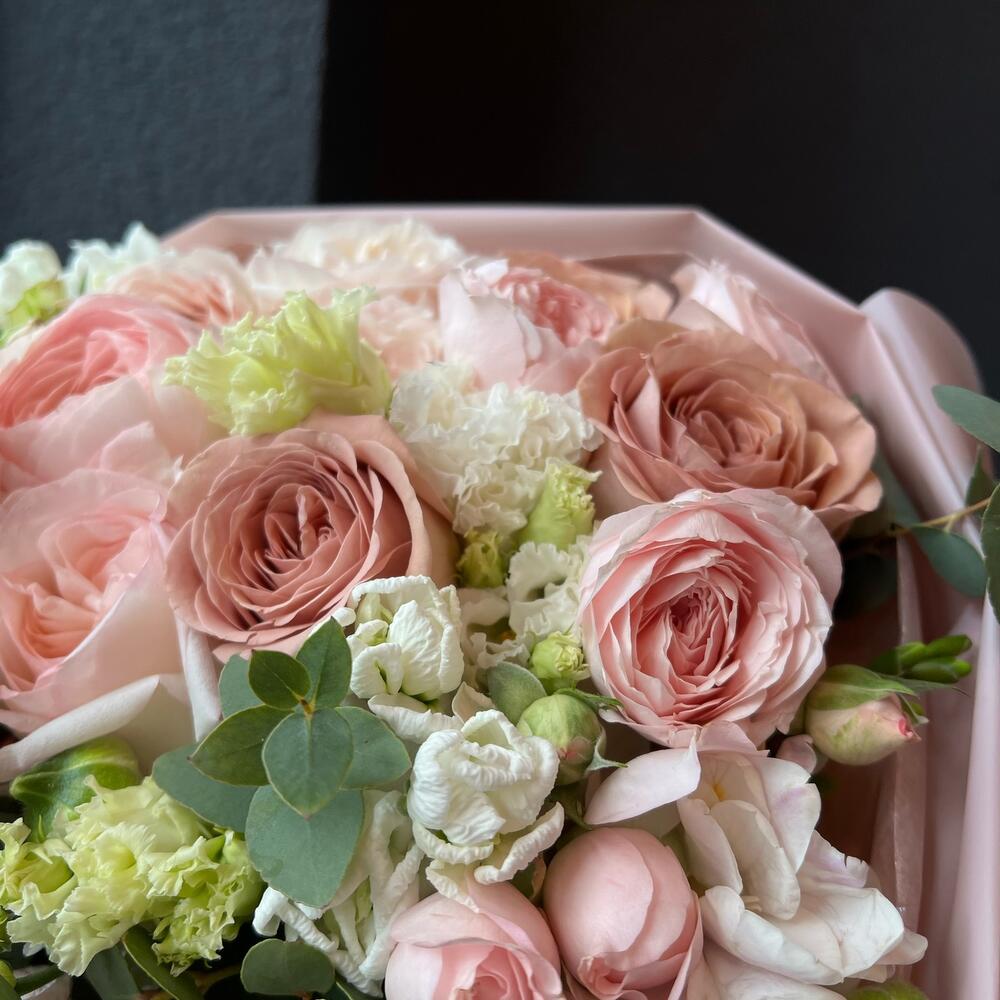Лизиантус – 4 шт.Маттиола – 3 шт.Фрезия – 3 шт.Эвкалипт – 3 шт.Пионовидная роза – 3 шт.Атласная лента – 1 шт.Кустовая пионовидная роза – 5 шт.декоративная упаковка – 1 шт.сортовая роза – 3 шт.ранункулюсы – 3 шт.