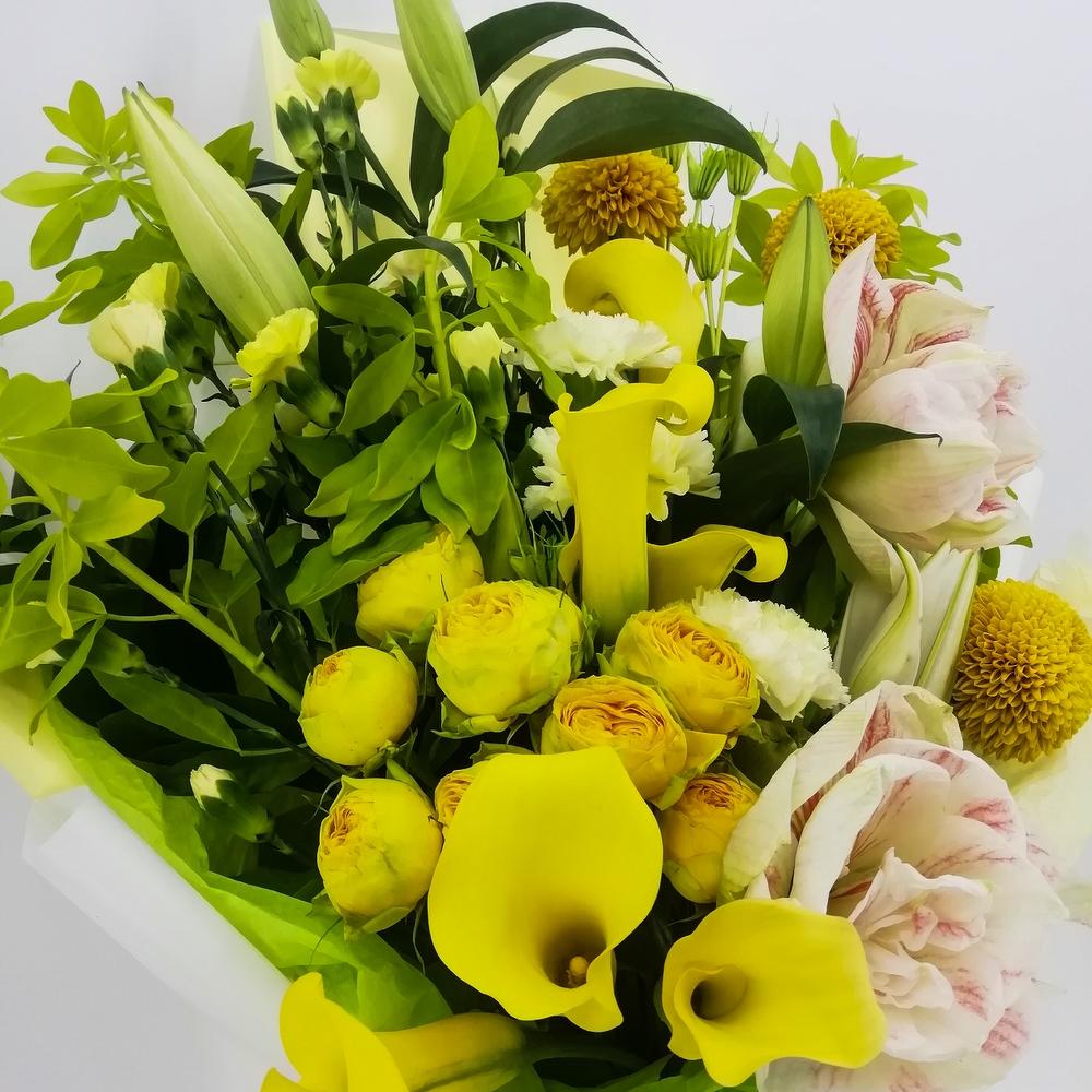 Амариллис – 2 шт.Калла – 5 шт.Кустовая роза пионовидная – 3 шт.Чойсия – 4 шт.Лилия белая – 2 шт.