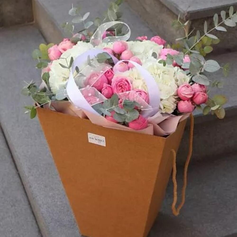 Букет "Sylvie" с гортензией, пионовидной розой и эвкалиптом. Заказав букет с доставкой от Da Vinci, Вы скрасите день обладательницы букета и подарите ей незабываемые эмоции.