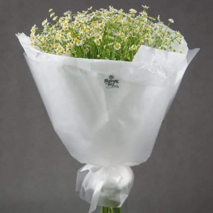 Кустовая пионовидная роза – 5 шт. ромашки (танацетум) – 6 шт. Оформление – 1 шт.