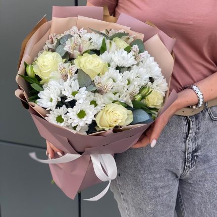 Букет Нежное прикосновение с белыми розами и хризантемами