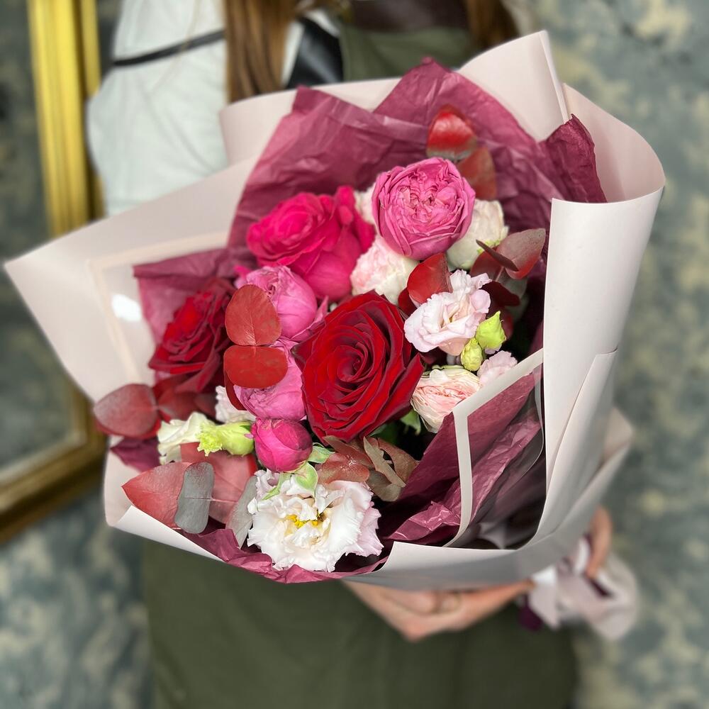 Роза Pink Floyd – 1 шт.Роза Эксплорер – 2 шт.роза кустовая пионовидная джульетта церайз – 1 шт.роза кустовая пионовидная мэнсфилд парк – 1 шт.эустома розовая – 1 шт.Эвкалипт – 1 шт.Тишью – 2 шт.Пленка матовая – 5 шт.Лента атласная – 2 шт.