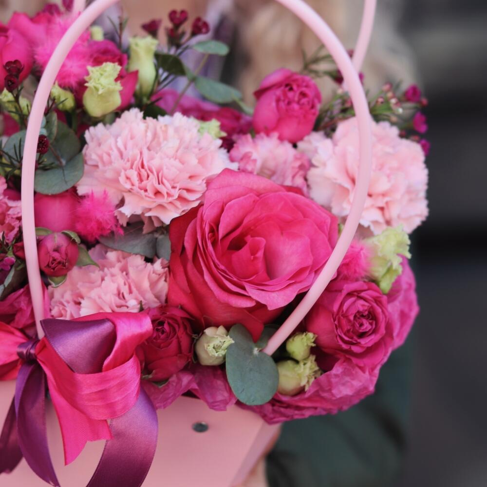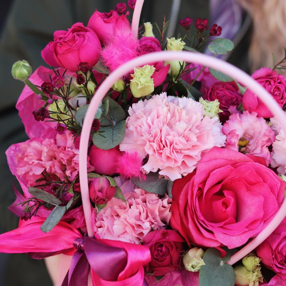Яркая, чувственная и воздушная композиция, выполненная из малиновых роз, лизиантуса, гвоздик и ваксфлауэра.Такая композиция точно понравится яркой и энергичной получательнице, и будет долго радовать её.К композиции прилагается открытка с вашими пожеланиями и приятный комплимент от нашего магазина – шоколадка. Мы также будем рады отправить вместе с композицией конфеты, шоколад ручной работы или б/а вино по вашим пожеланиям, просто напишите нам в личные сообщения. Заказывая нашу композицию, Вы всегда получите исключительный сервис и заботу о клиенте