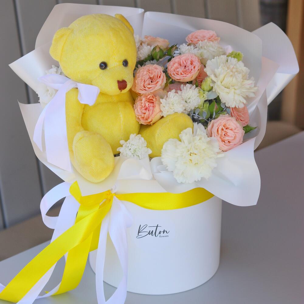 Цветы и мишка: цветочный подарок в коробке