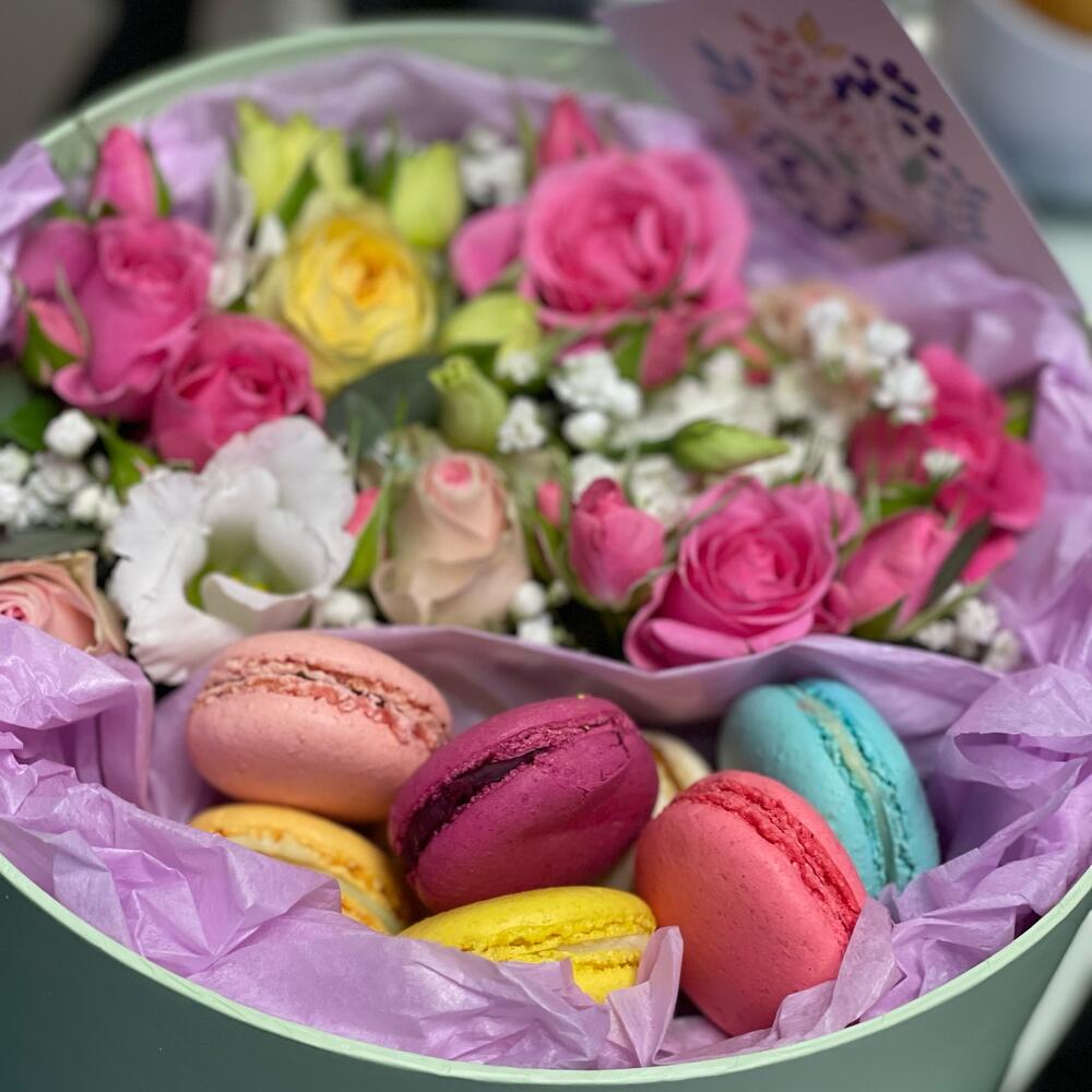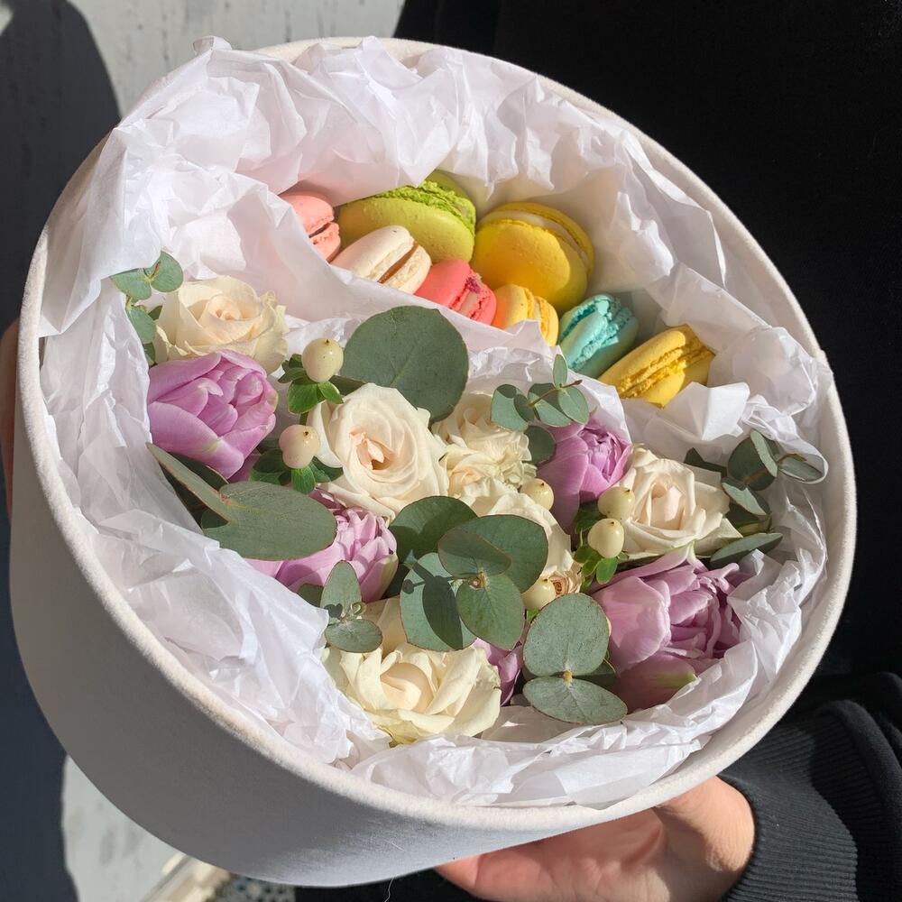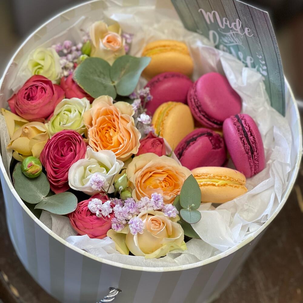 “Атлас☁️” – цветочная композиция с зефиром в деревянном ящике