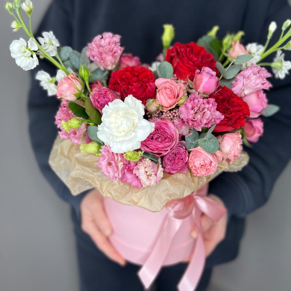 Цветы в коробке с красными розами