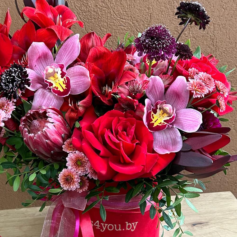 Страстная Алая коробка только для самых искушенных, ценящих роскошь и эстетику людей. Очень экстравагантная с экзотическим цветами, абсолютно не банальная композиция. Производит «вау» впечатление с первого взгляда !