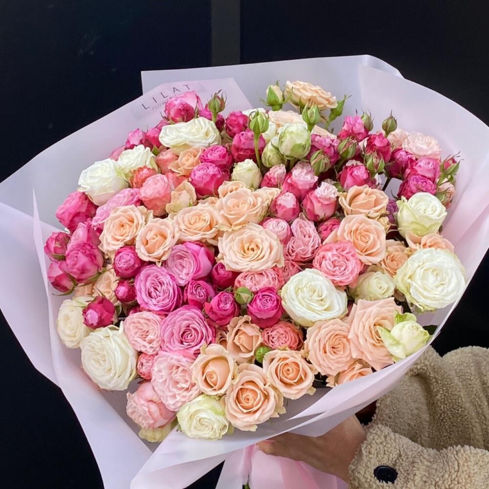 Упаковка дизайнерская – 3 шт. Пионовидная кустовая роза – 17 шт. Открыточка с вашими пожеланиями – 1 шт. доставка – 1 шт.