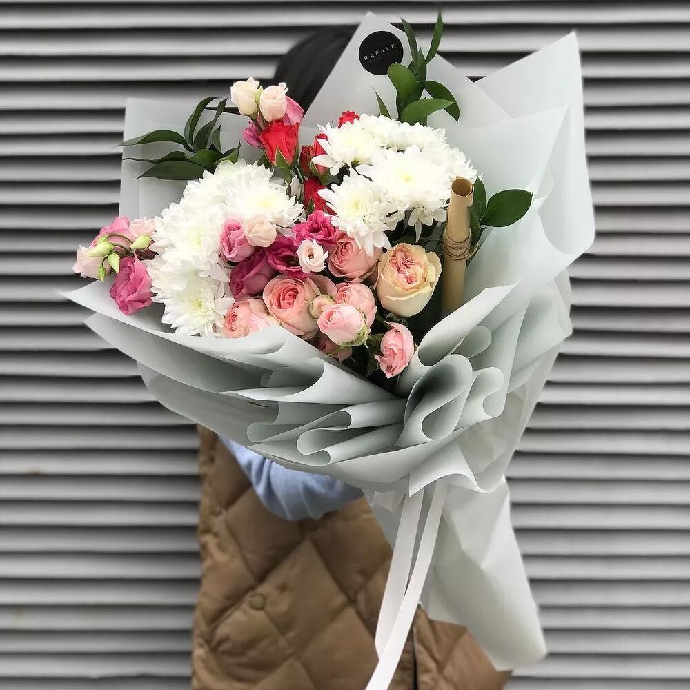 Роза голландская 60 см – 3 шт. астильба (голландия) – 2 шт. лизиантус (израиль) – 2 шт. эвкалипт (голландия) – 2 шт. спрей роза (кения) – 2 шт. хризантема кустовая (голландия) – 2 шт.