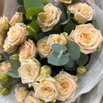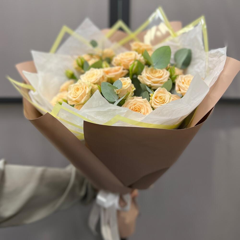 Эвкалипт – 3 шт.Лента атласная – 2 шт.Пленка матовая – 4 шт.Тишью белое – 3 шт.роза кустовая таня – 5 шт.пленка дизайнерская с каймой – 2 шт.