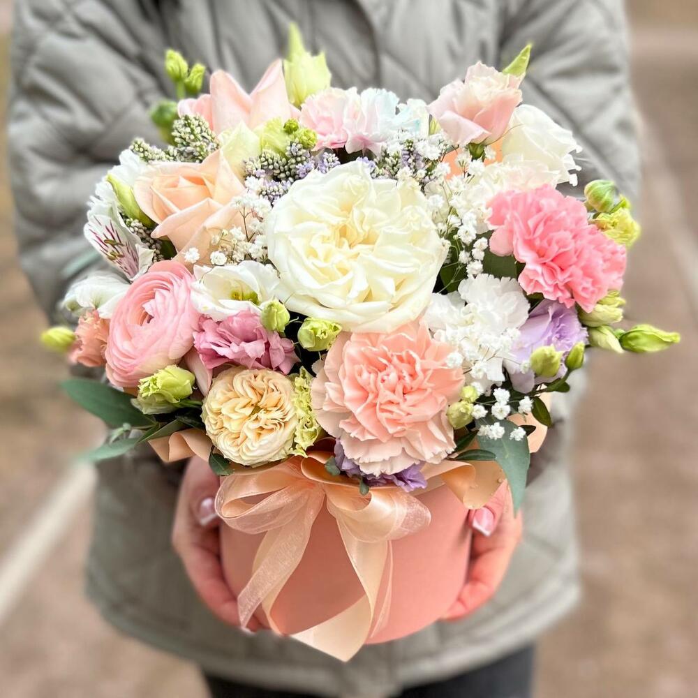 Роза пионовидная одноголовая – 1 шт.Роза пионовидная кустовая – 1 шт.Вероника – 1 шт.Диантус – 1 шт.Эустома – 1 шт.Гипсофила – 1 шт.Роза одноголовая – 1 шт.Альстромерия – 1 шт.Ранункулюс – 1 шт.зелень эвкалипта – 1 шт.