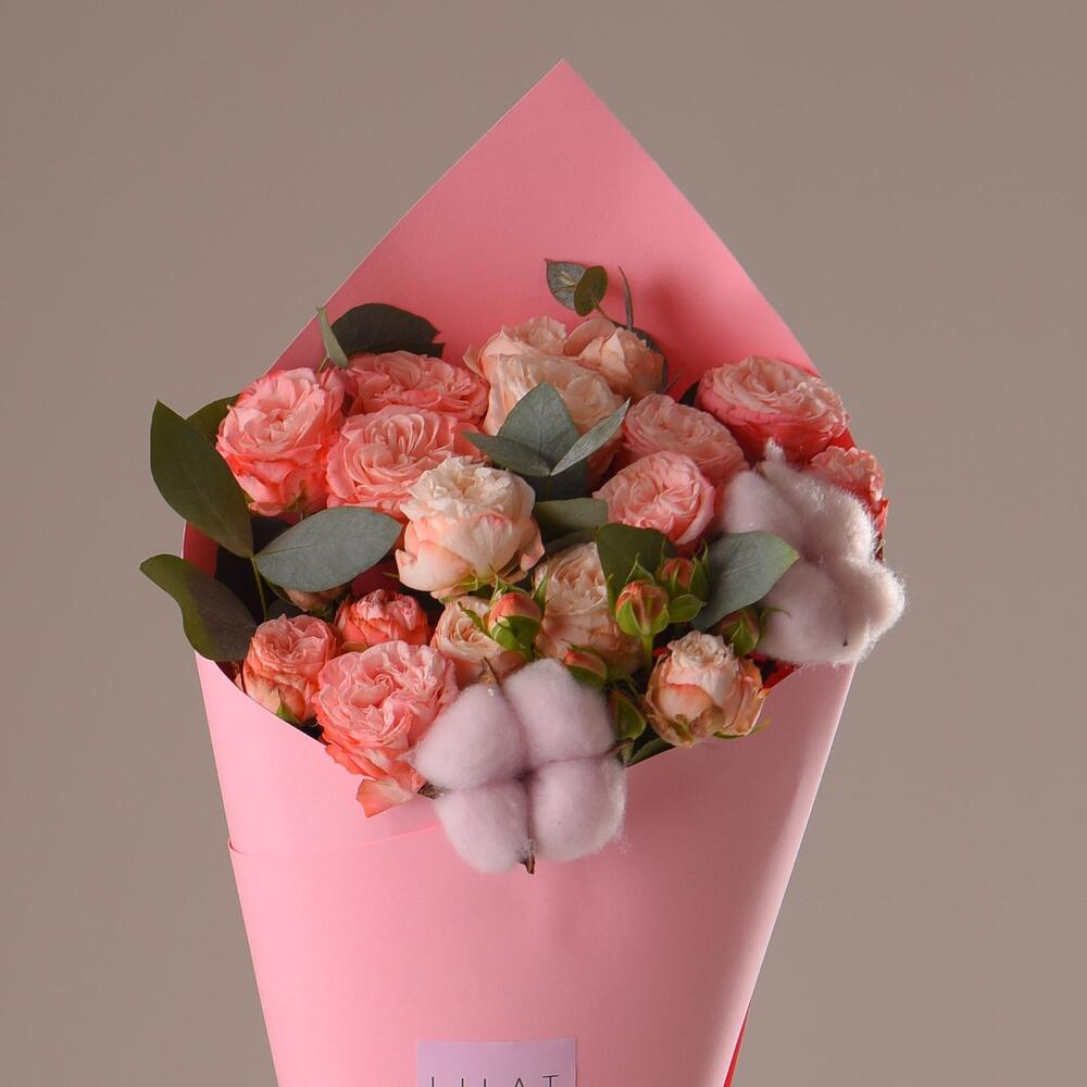 кустовые пионовидные розы – 19 шт. Упаковка дизайнерская – 1 шт. Оазис флористический – 1 шт. Эвкалипт – 2 шт. Открыточка с вашими пожеланиями – 1 шт.