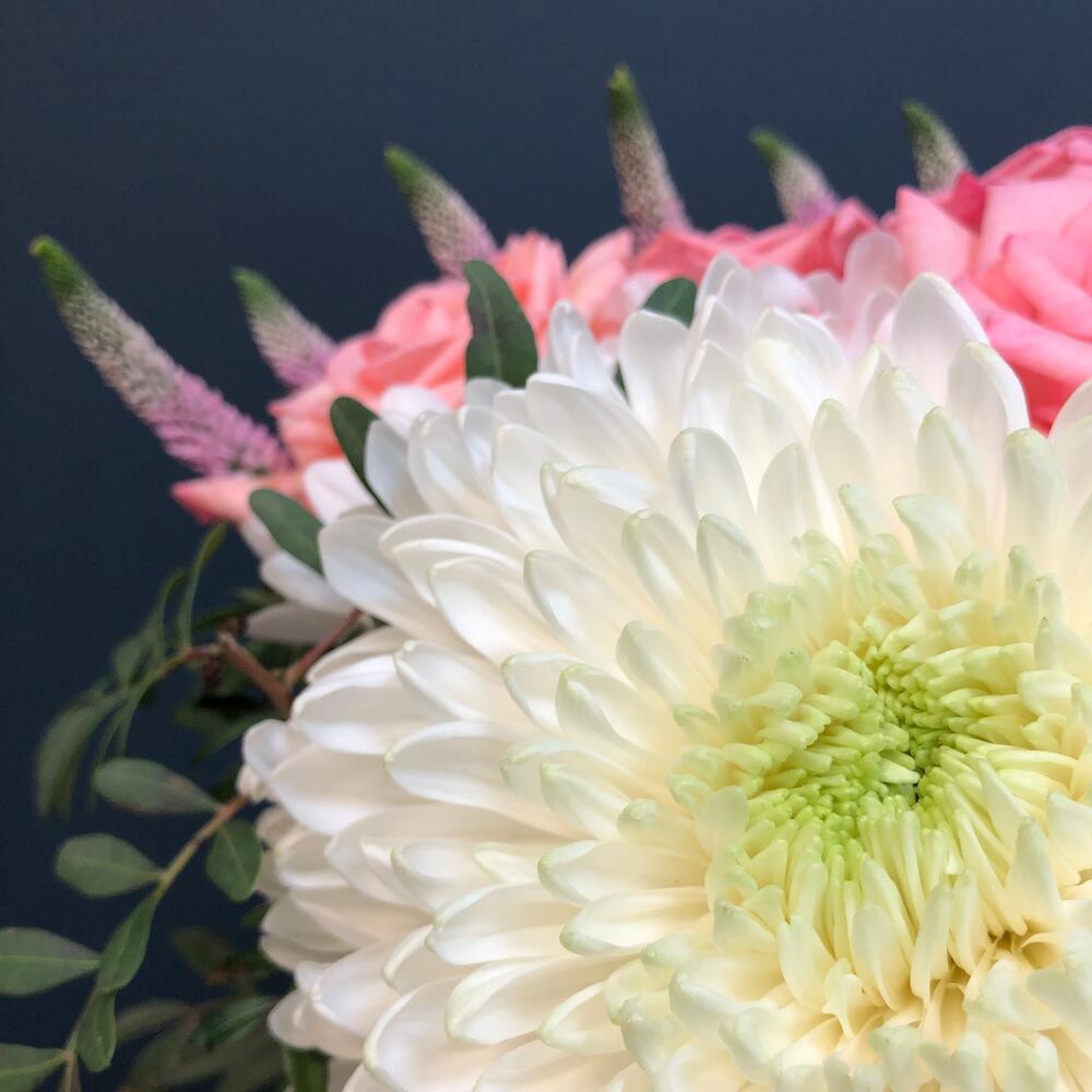 Вероника – 10 шт.Роза розовая – 9 шт.Хризантема кустовая белая – 3 шт.Хризантема одноголовая белая – 1 шт.