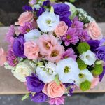 Роза розовая – 3 шт. Роза белая – 2 шт. эустома фиолетовая – 1 шт. Хризантема зеленая – 1 шт. Хризантема розовая – 2 шт. Статица синяя – 2 шт. эустома розовая – 1 шт. эустома белая – 1 шт.