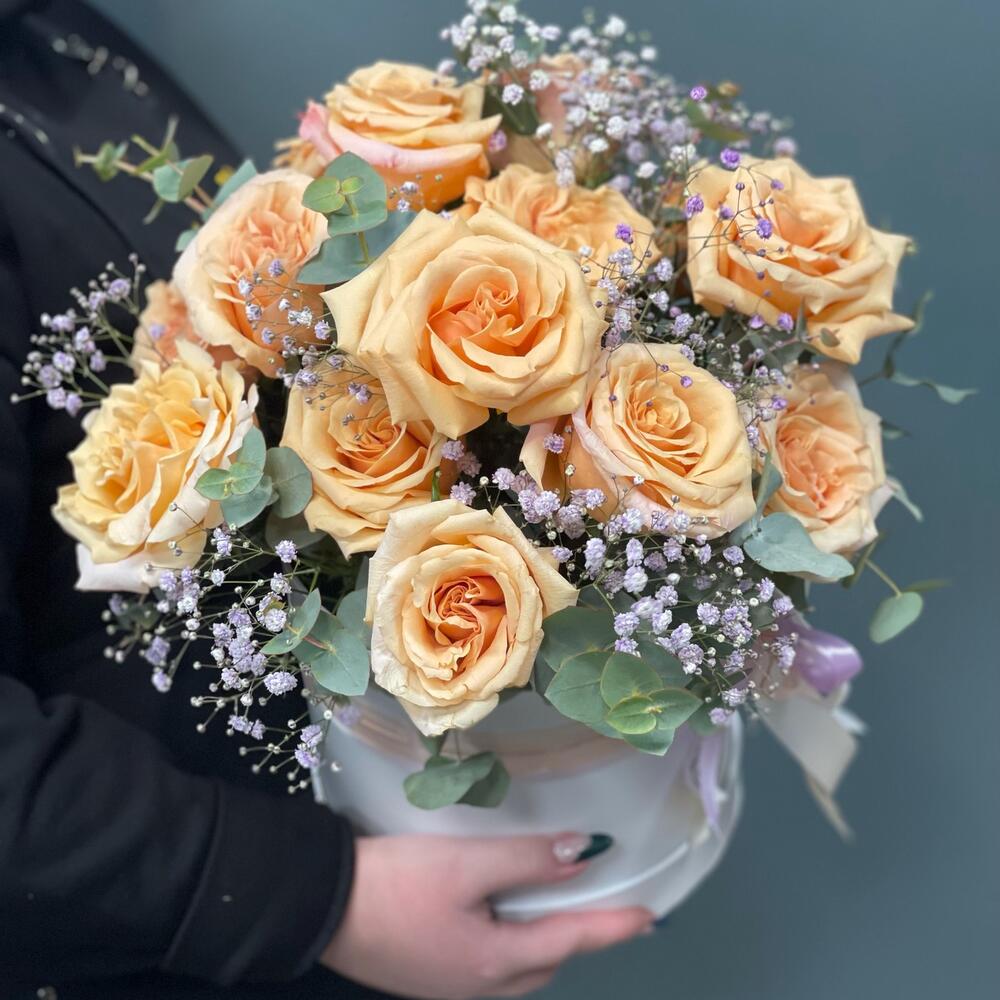 Композиция в шляпной коробке с персиковыми розами
