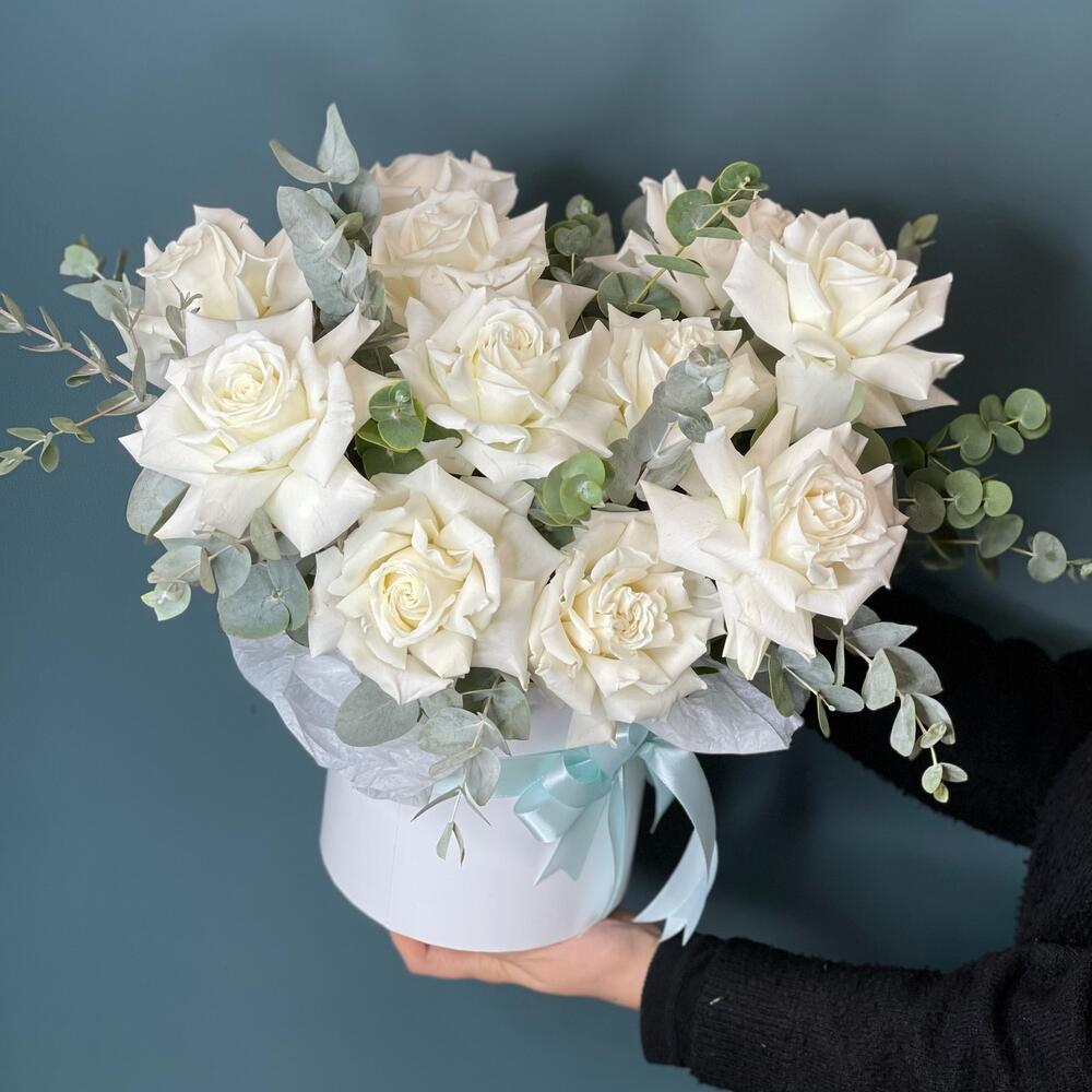 Роза – 11 шт.Эвкалипт – 4 шт.Коробка шляпная – 1 шт.Лента – 1 шт.Оазис – 1 шт.Тишью – 1 шт.