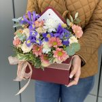 Конверт с цветами из ирисов, хризантемы, кустовой розы, сортовой гвоздики и зелени!