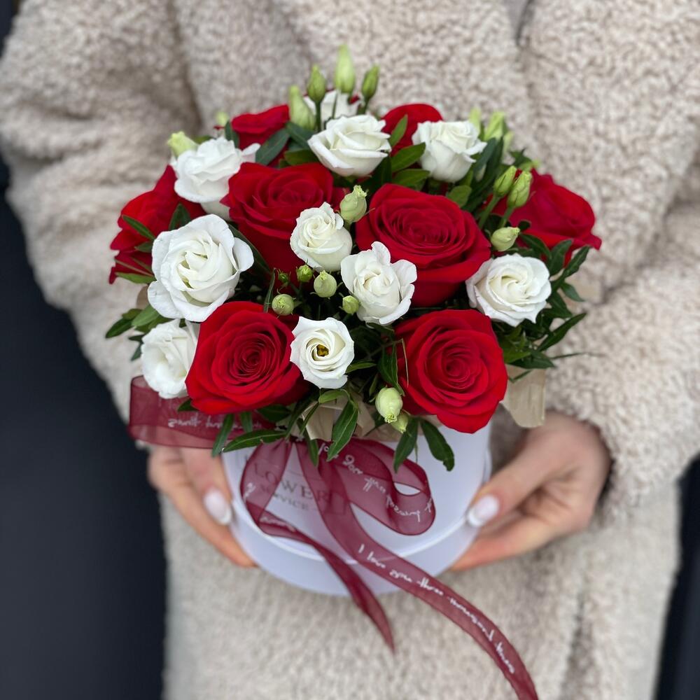 красная роза сорта фридом – 9 шт. эустома белая – 3 шт. Писташ – 2 шт. Оазис – 1 шт. Коробка – 1 шт.