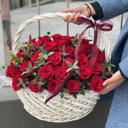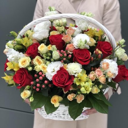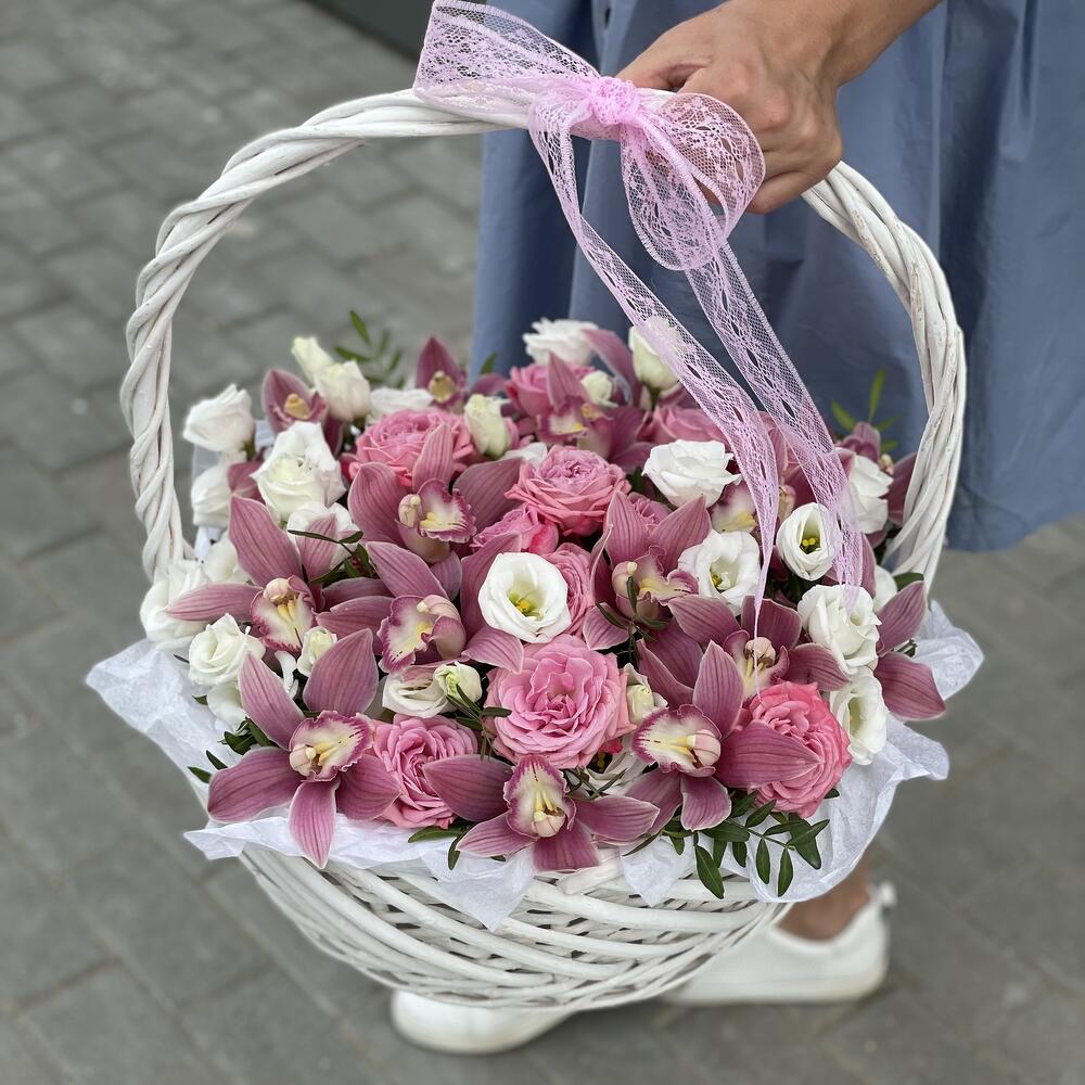 Корзина из цветков орхидеи, роз, эустомы и зелени!