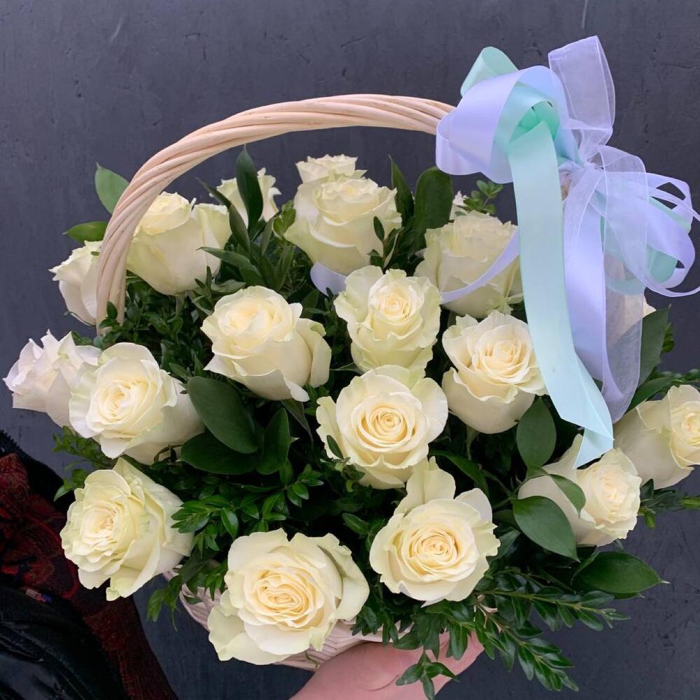 Корзина – 1 шт.Рускус – 10 шт.Роза белая – 25 шт.Оазис флористический – 1 шт.