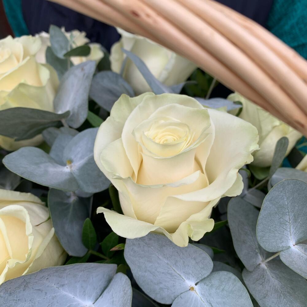 Корзина с белыми розами и эвкалиптом Эвкалиптовый лес