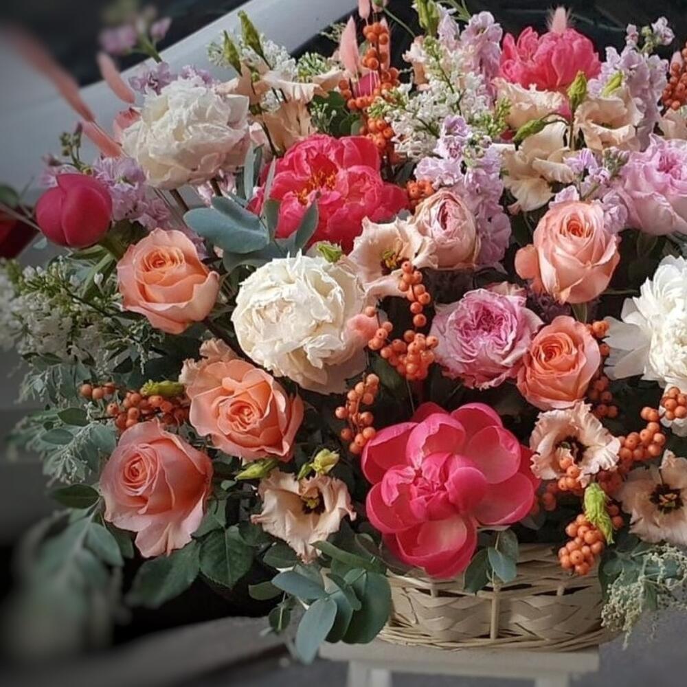 Корзина с пионами,маттиолой и пионовидными розами