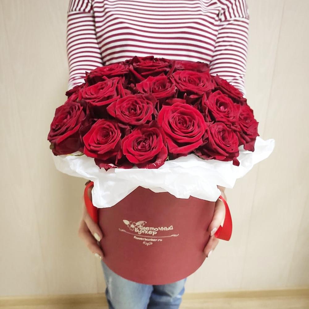 Роза красная 60 см – 51 шт.Шляпная коробка – 1 шт.Бумага тишью – 1 шт.Аквабокс – 1 шт.