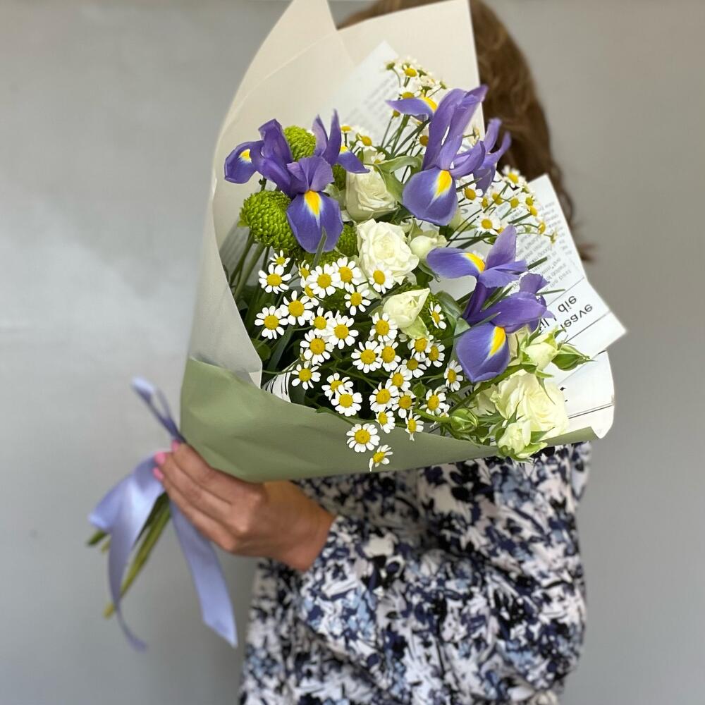 Ирис – 3 шт.Сантини – 2 шт.Матрикария – 2 шт.Роза кустовая – 1 шт.Упаковка дизайнерская – 2 шт.