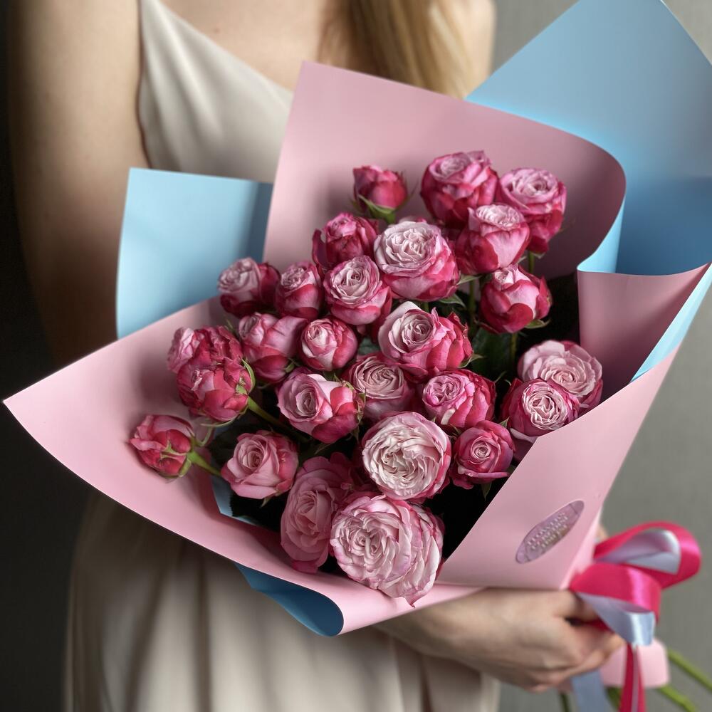 Кустовая роза – 7 шт. Упаковка – 1 шт. Атласная лента – 1 шт.