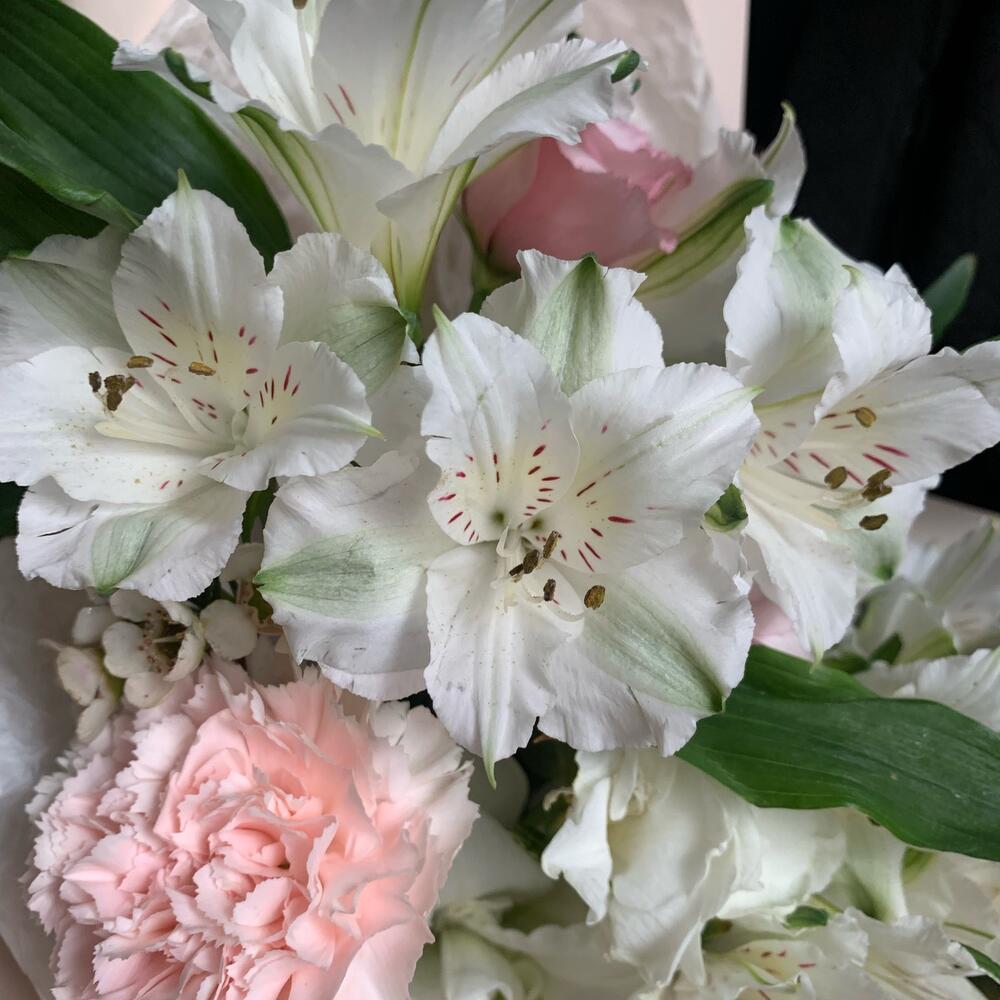 Нежный букет с розами, диантусами и альстромерией