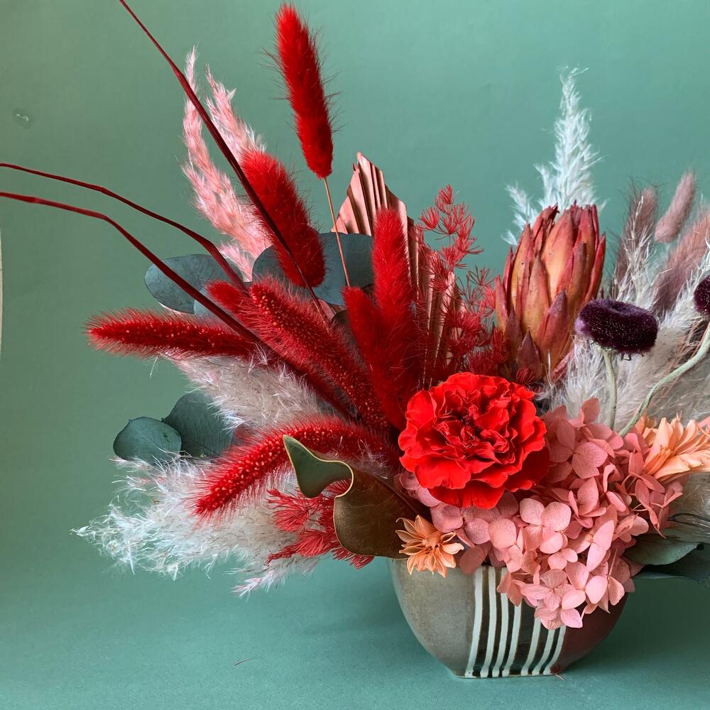 Кашпо керамическое – 1 шт.Роза стабилизированная – 1 шт.пампасная трава – 5 шт.Эвкалипт стабилизированный – 2 шт.Лагурус (сухоцвет) – 12 шт.Нигелла сухоцвет – 5 шт.пальма пика – 1 шт.Оазис флористический – 1 шт.листья магнолии – 2 шт.гербера сухоцвет – 2 шт.аспарагус стабилизированный – 3 шт.гортензия стабилизированная – 1 шт.сетария сухоцвет – 3 шт.Протея африка – 1 шт.