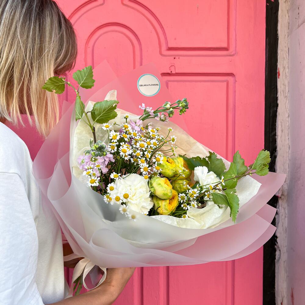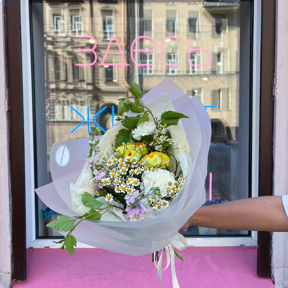 Полевой букет с ромашками, маттиолой , пионовидной розой