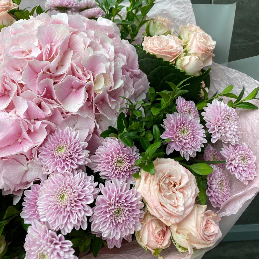 Нежный букет в розовых тонах. Отличное сочетание гортензии и пионовидной розы,с добавлением прекрасной сантини. Легкий воздушный букет станет отличным презентом на любое мероприятие: день рождения,свадьба или же просто коллеге по работе.