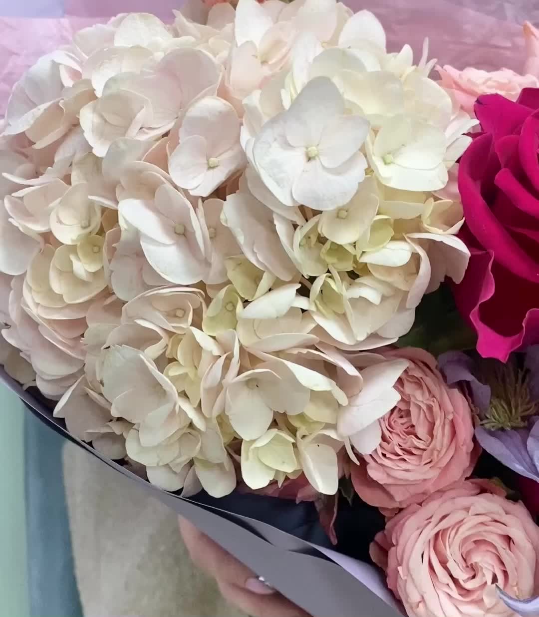 Гортензия – 1 шт.Тишью – 1 шт.Клематис – 2 шт.Пленка матовая – 1 шт.Диантус сортовой – 2 шт.Мадам бомбастик – 2 шт.Роза – 3 шт.