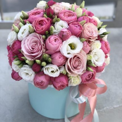 Композиция из пионовидной кустовой розы и эустомы Милой кокетке