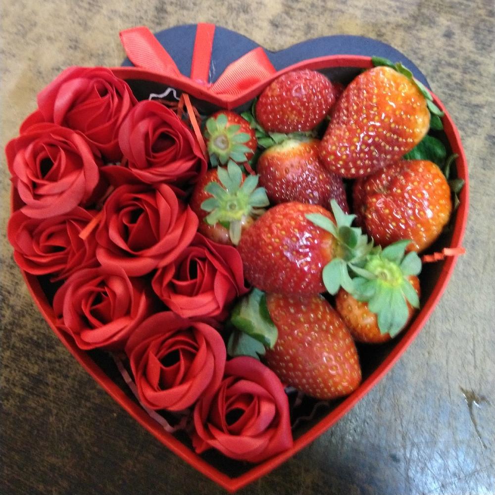 Сердце с розами и вкусной клубникой, это отличный и оригинальный подарок для влюбленных.