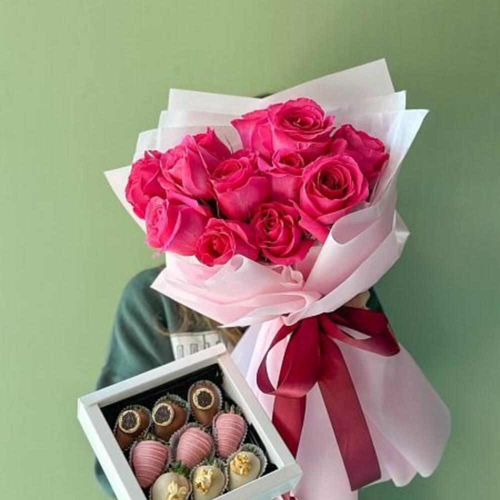Сет "Emily". Моно букет роз и коробочка клубники в шоколаде