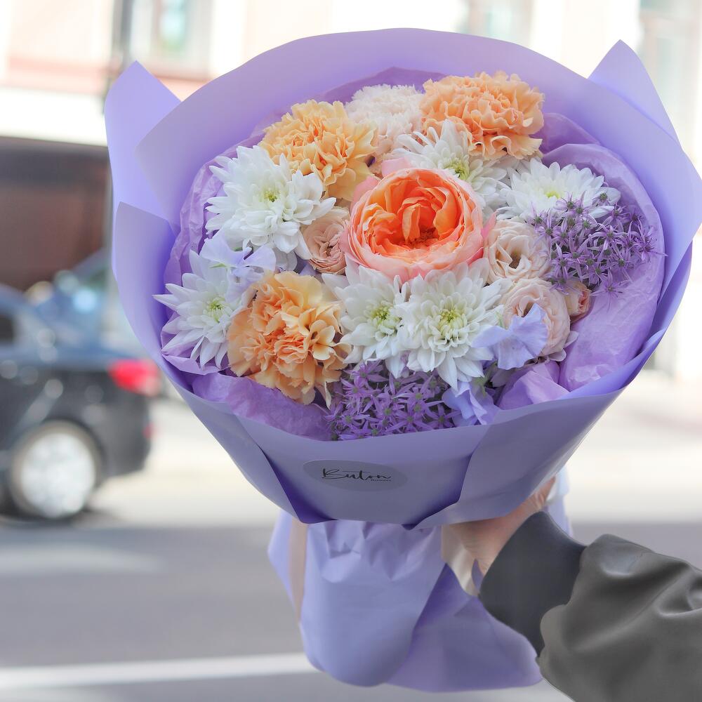 Латирус – 2 шт.Роза кустовая – 2 шт.Хризантема кустовая – 2 шт.Гвоздика – 4 шт.Аллиум – 1 шт.Открыточка с вашими пожеланиями – 1 шт.Шоколадка – 1 шт.Дизайнерская упаковка – 1 шт.роза садовая айко – 1 шт.