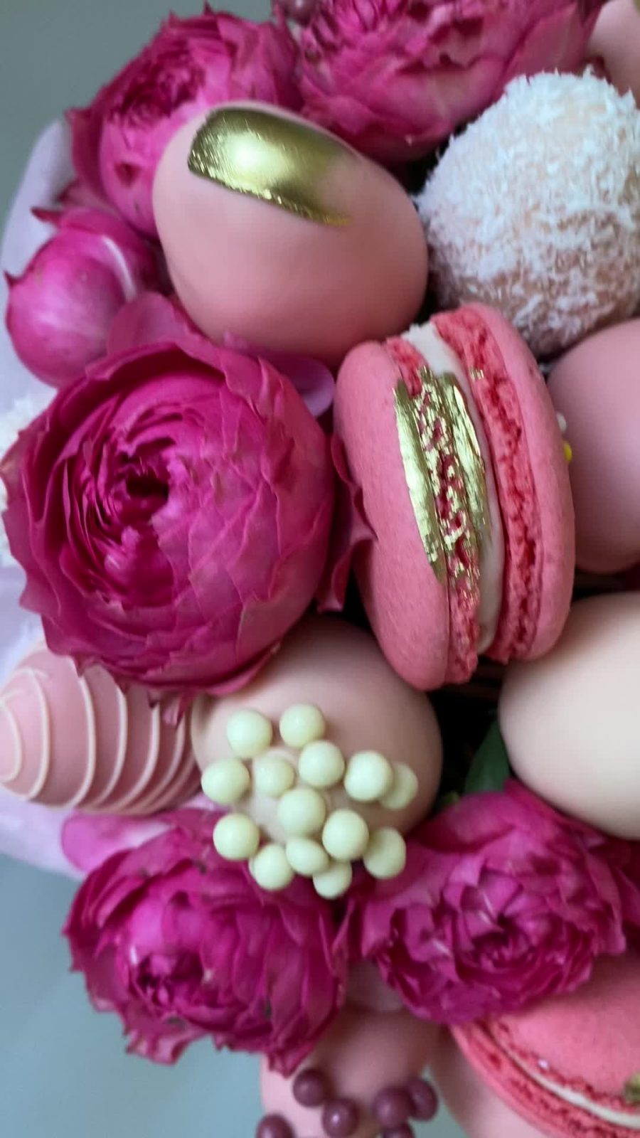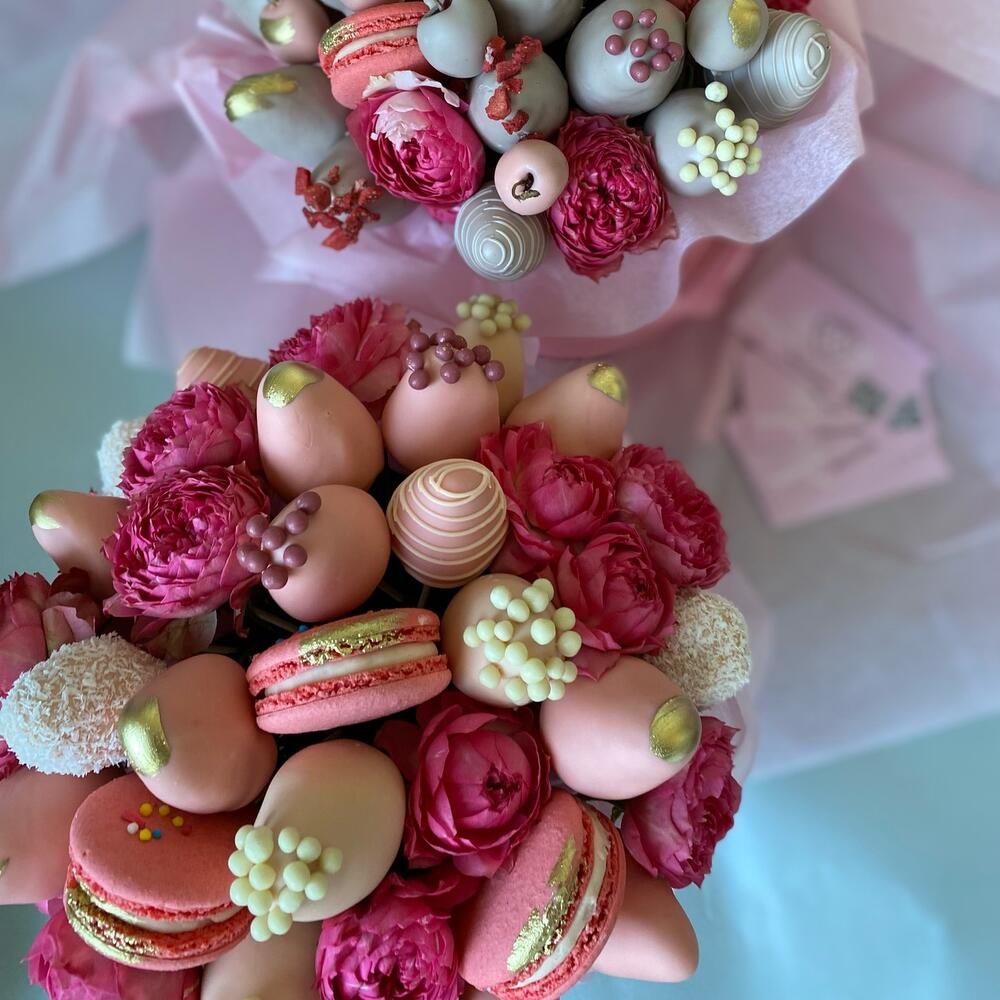 Пионовидная кустовая роза – 3 шт.макарон (пирожное) – 5 шт.Клубника в шоколаде callebaut (бельгия) – 25 шт.