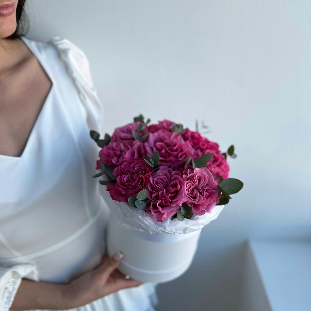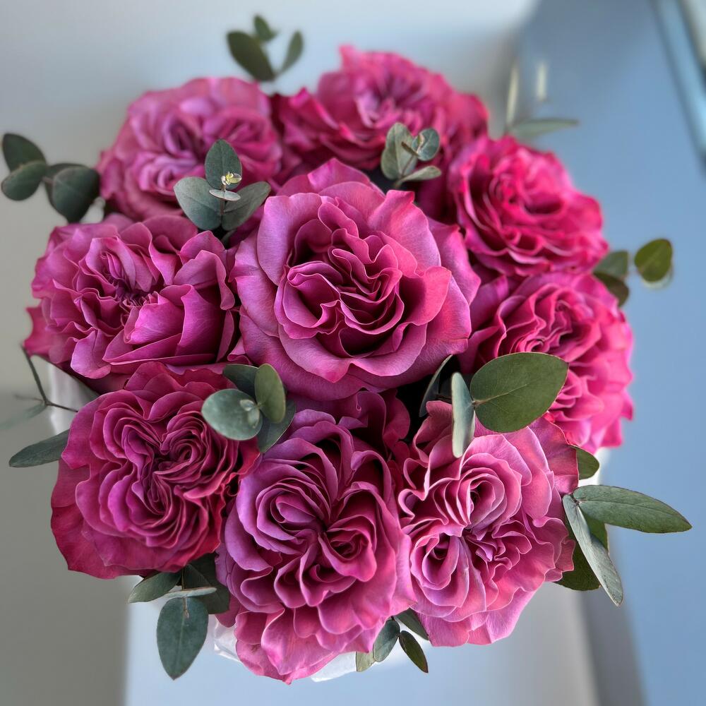 Шляпная коробка с фиолетовой пионовидной розой и эвкалиптом, небольшого размера, 20 см в диаметре и 25 см высотой