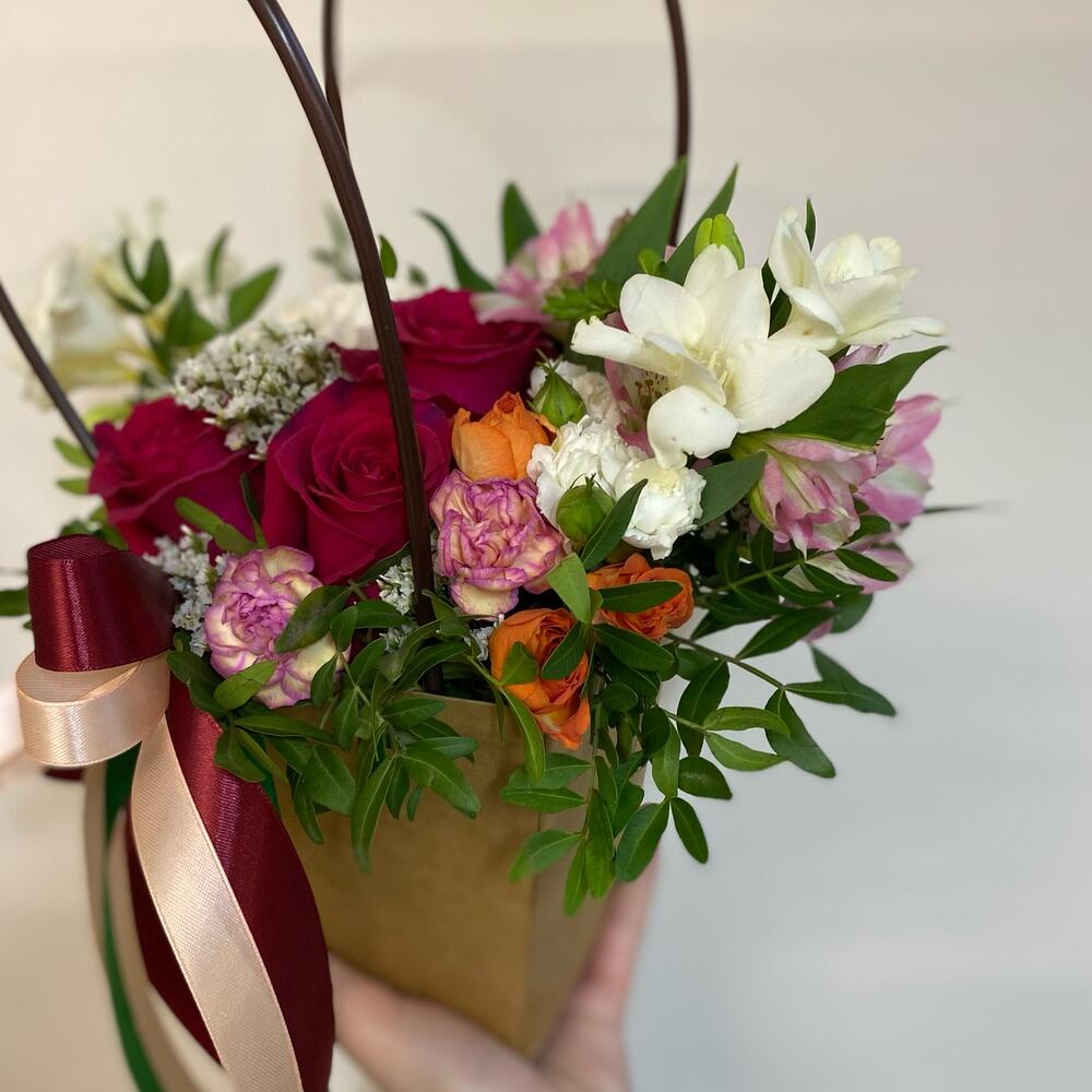 Цветочная композиция из разнообразных цветов в крафтовой сумочке.Быстрая сборка букетов и композиций из свежих цветов. Цветы бережно доставляются нашими курьерами.Обращаем внимание, что букет может отличаться от заявленного на фото по цветовой гамме, форме и расположению … Показать ещёцветов. Но мы всегда сохраняем стилистику, настроение, цветовую гамму, состав и стараемся максимально повторить работу при наличии необходимых цветов. Как