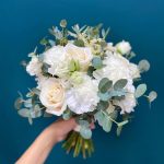 Авторский букет из голубой Гортензии, пионовидных Роз и Хризантемы Момоко