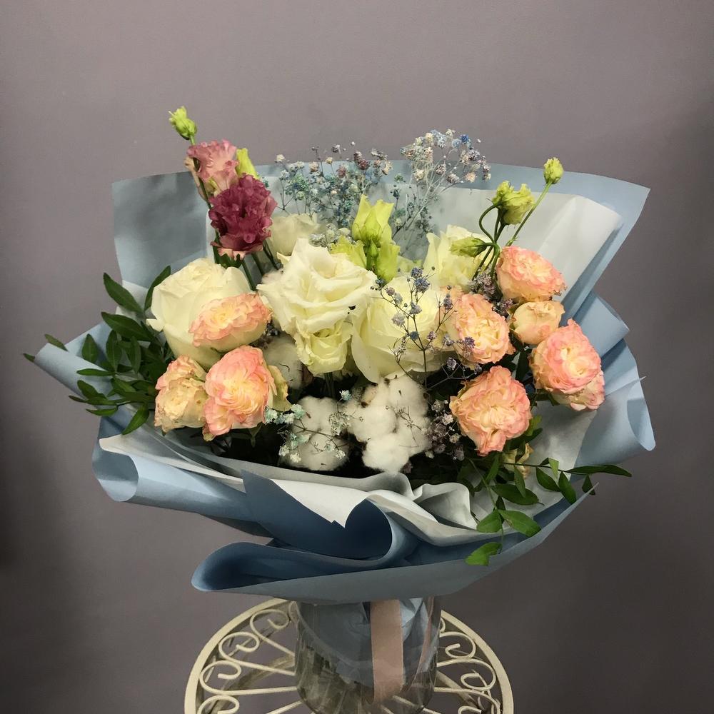 Роза белая – 3 шт.Роза кустовая – 3 шт.Хлопок натуральный – 3 шт.Гипсофила – 2 шт.Эустома – 2 шт.Фисташка – 3 шт.Упаковка дизайнерская – 1 шт.Лента атласная – 1 шт.
